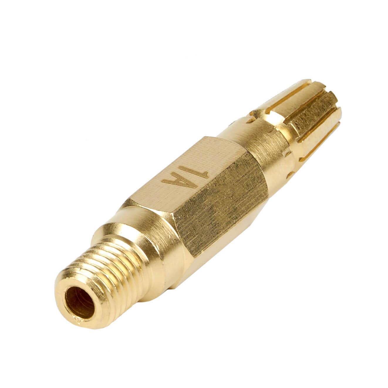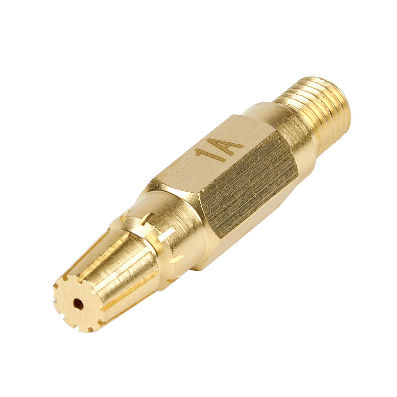 Латунный внутренний мундштук №1А для инжекторных ацетиленовых резаков Р2А-02М. Толщина разрезаемого металла 8–15 мм. Мундштук с шлицевыми пазами для выхода подогревающего пламени.