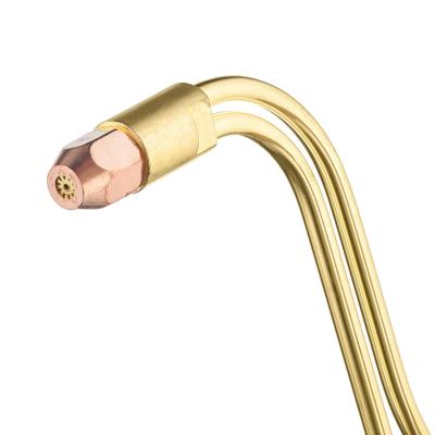 Универсальный трехтрубный резак внутрисоплового смешения газов для резки металла толщиной до 300 мм. Рычаг клапана располагается снизу. Резак можно использовать при работе с пропаном и ацетиленом. В комплект поставки к резаку входит пропановый разборный мундштук, ниппели и накидные гайки для крепления газового рукава. Не требует установки огнепреградительных клапанов.
