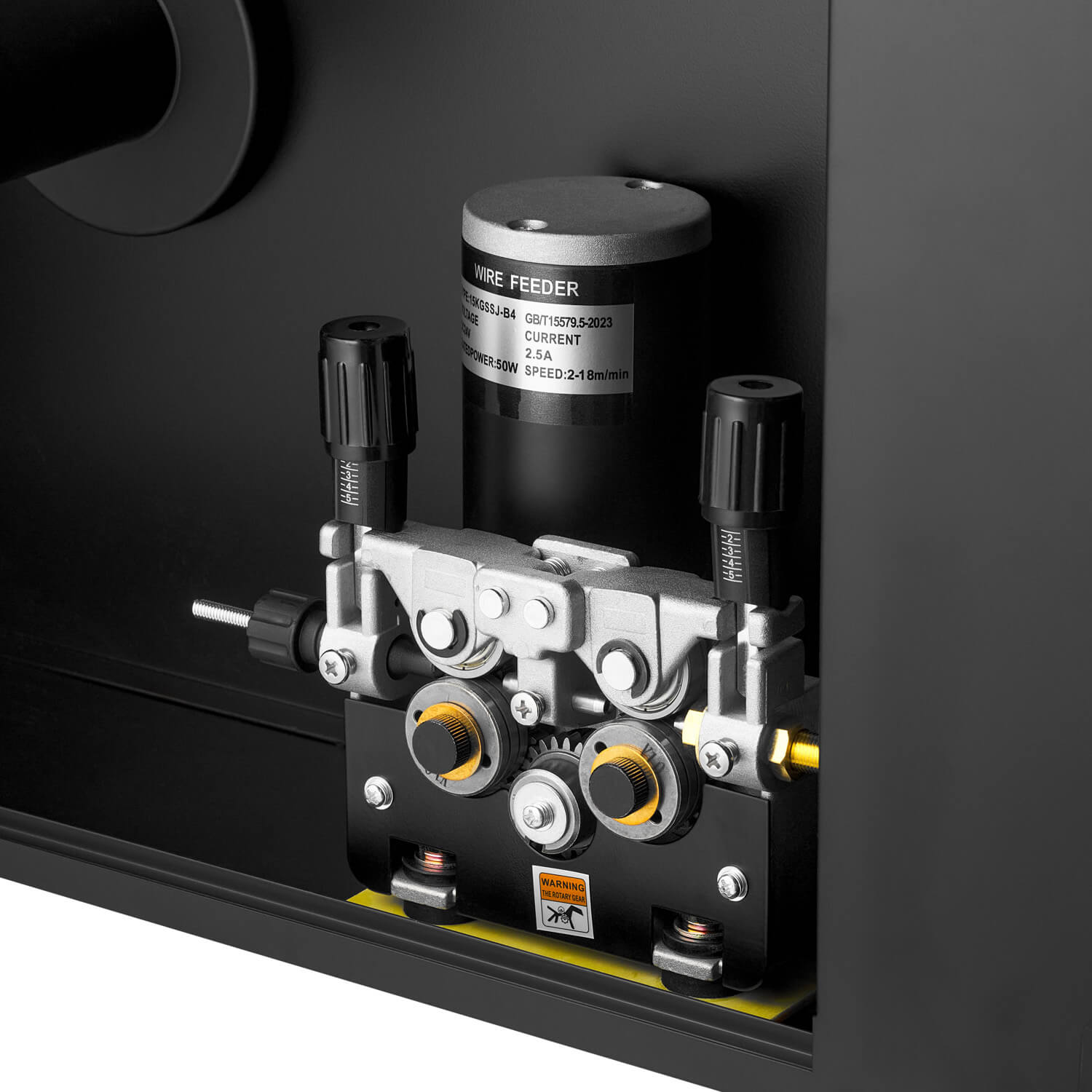 Уникальное отличие оборудования заключается в металлическом 4-х роликовом механизме подачи проволоки, где установлены ролики с габаритными размерами 30х10х12 для стальной проволоки диаметром от 0,8 до 1,0 мм.